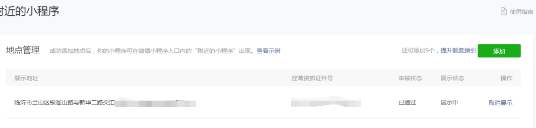 临沂女装商城的微信小程序,增加附近小程序的功能的时候,地点的审核过了,也展示了,为什么再手机上面的附近小程序始终不显示呢?