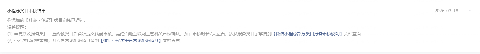 1.最新版本涉及【社交_笔记】报备类目首次提审,当前已于【2026-03-19】进入报备审核,预计7*24h【2026-03-26】可返回预上线通知。届时可支持与上线~