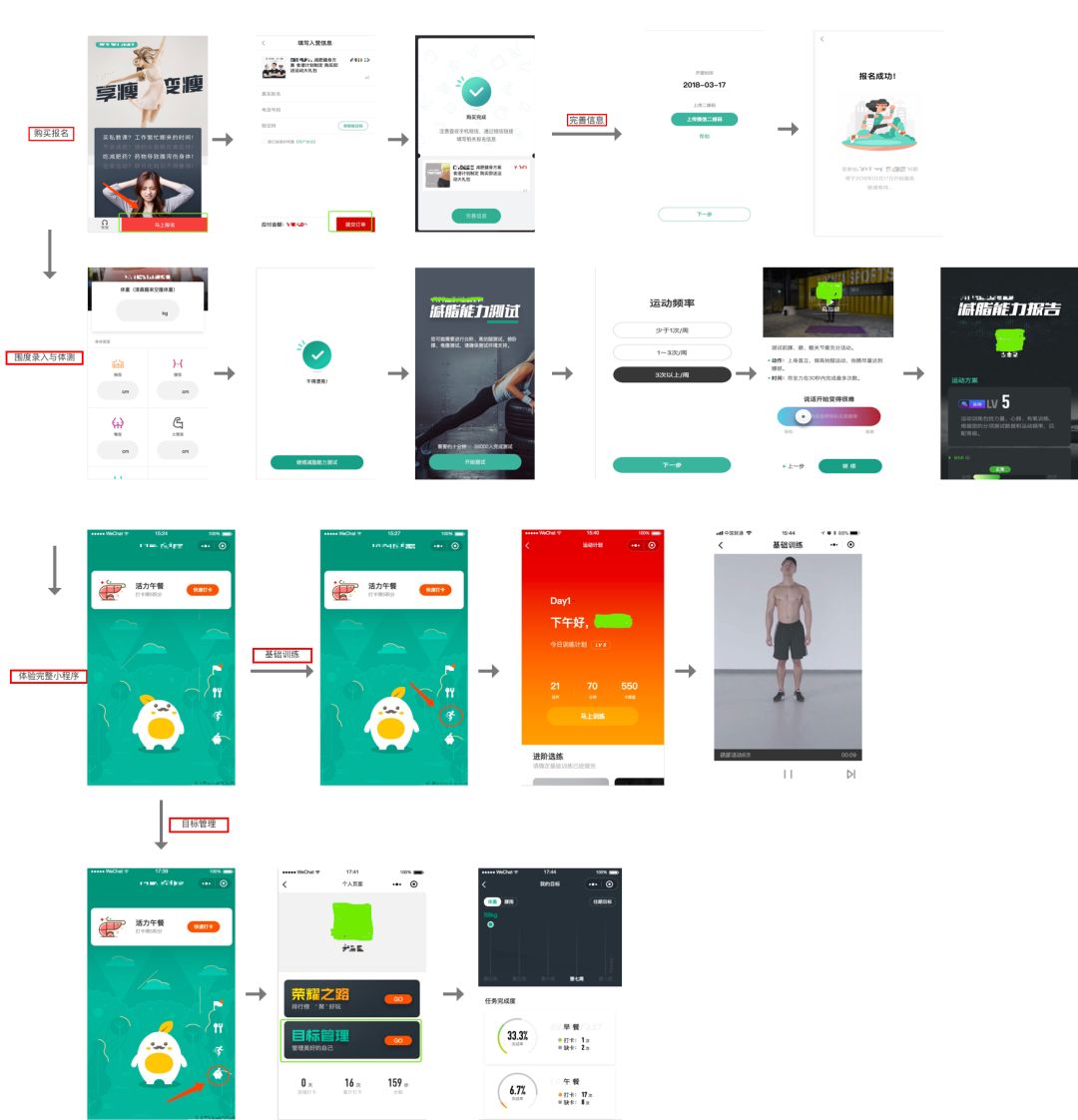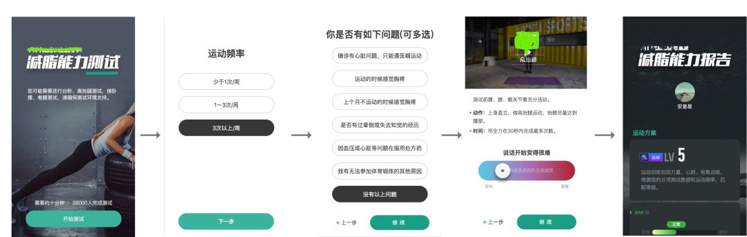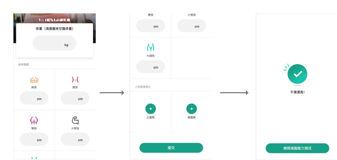 上面提到,用户为了体验到基础训练和目标管理功能,需要完成围度录入和体测。所谓围度录入,就是需要用户再开营的时候记录,用户当时的体重和腰围,然后在结营的时候做一个对比。而体测的作用就是,通过一系列的测试,来反映用户此时的健康状态,以此作为依据来制定基础训练计划。