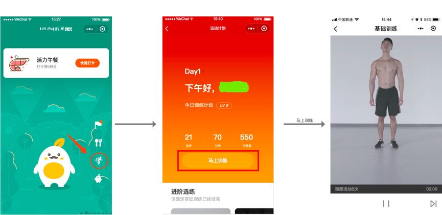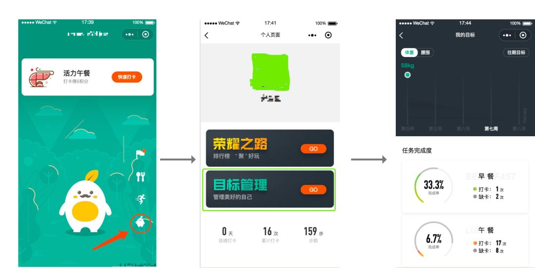 而在上述过程中,小程序的作用是,督促用户严格执行减脂运动计划(需要通过小程序打卡),提供健康饮食食谱,给用户直观地展示他的变化轨迹等等。