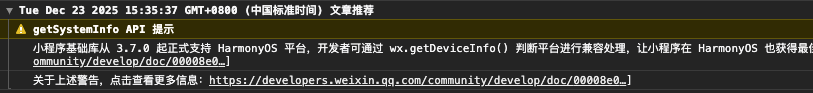 结论: 这个警告可以忽略,因为我们已经完成了必要的适配工作。当用户在 HarmonyOS 设备上使用小程序时,代码会自动识别并进行相应的兼容处理。