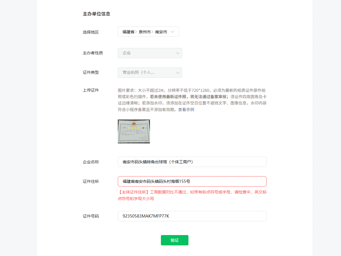 小程序appid : wxb76004dbe60ba036 在备案的时候填写的地址是证件注册地址,但是提交的时候出现 【主体证件住所】工商数据对比不通过,如带有标点符号或字母,请检查中、英文标点符号和字母大小写 修改尝试多次也无法解决,而且到国家企业信用信息公示系统里进行过核对也没问题,请问这个是什么问题怎么处理