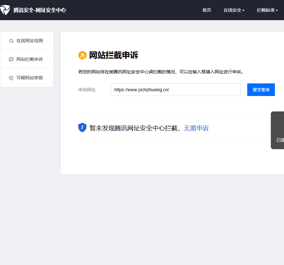 域名yichizhuxing.cn 是在阿里云做的备案,备案号:陕ICP备2025084576号-1,刚刚试运营,就提示这个,在安全中心检查也没发现任何问题,两次提交申请恢复访问,提示提交成功3个工作日通过微信团队公众号告知审核结果,但是两次申诉都未收到过任何反馈,图三是网站页面内容,请官方人员帮助查明去除提醒,以免影响后续的网站使用