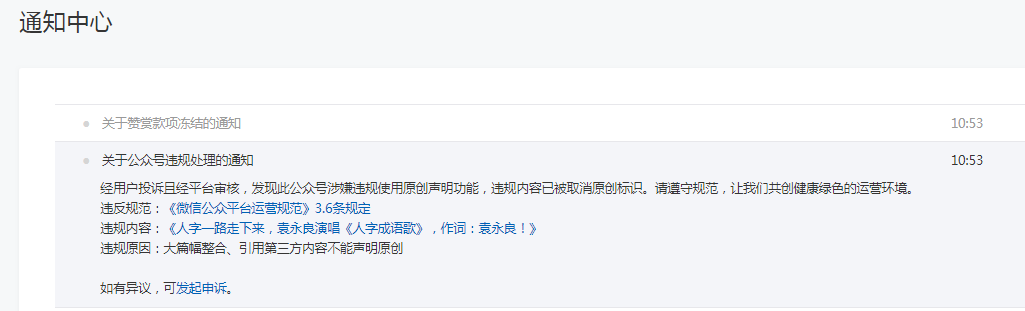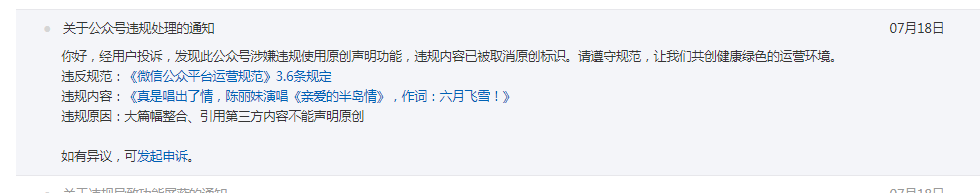 好不容易才维护一个公众号几年,刚刚起色,老是被人投诉。我猜是竟争对手,搞的鬼,本公众号是发雷州歌作品,有好几个公众号发雷州歌的,写词老师差不多每一个平台都发布作品,也许是竟争对手见公众号起色,眼红而投诉吧。