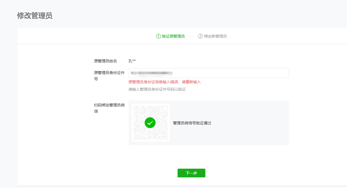 小程序准备更换一个管理员账号,按照提示第一步输入原管理员身份证号后,扫码验证通过,点击下一步就提示身份证有误,但是这边可以确定输入的身份证号是没有错误的,但是就是验证不通过。