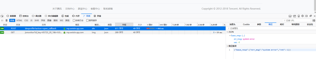 小程序“消息推送配置”无法提交 没有任何提示,不知道是什么原因。 服务器没有收到请求,换来3种浏览器都不可以,F12浏览器刚开始可以看到system error,现在我看直接提示js错误。