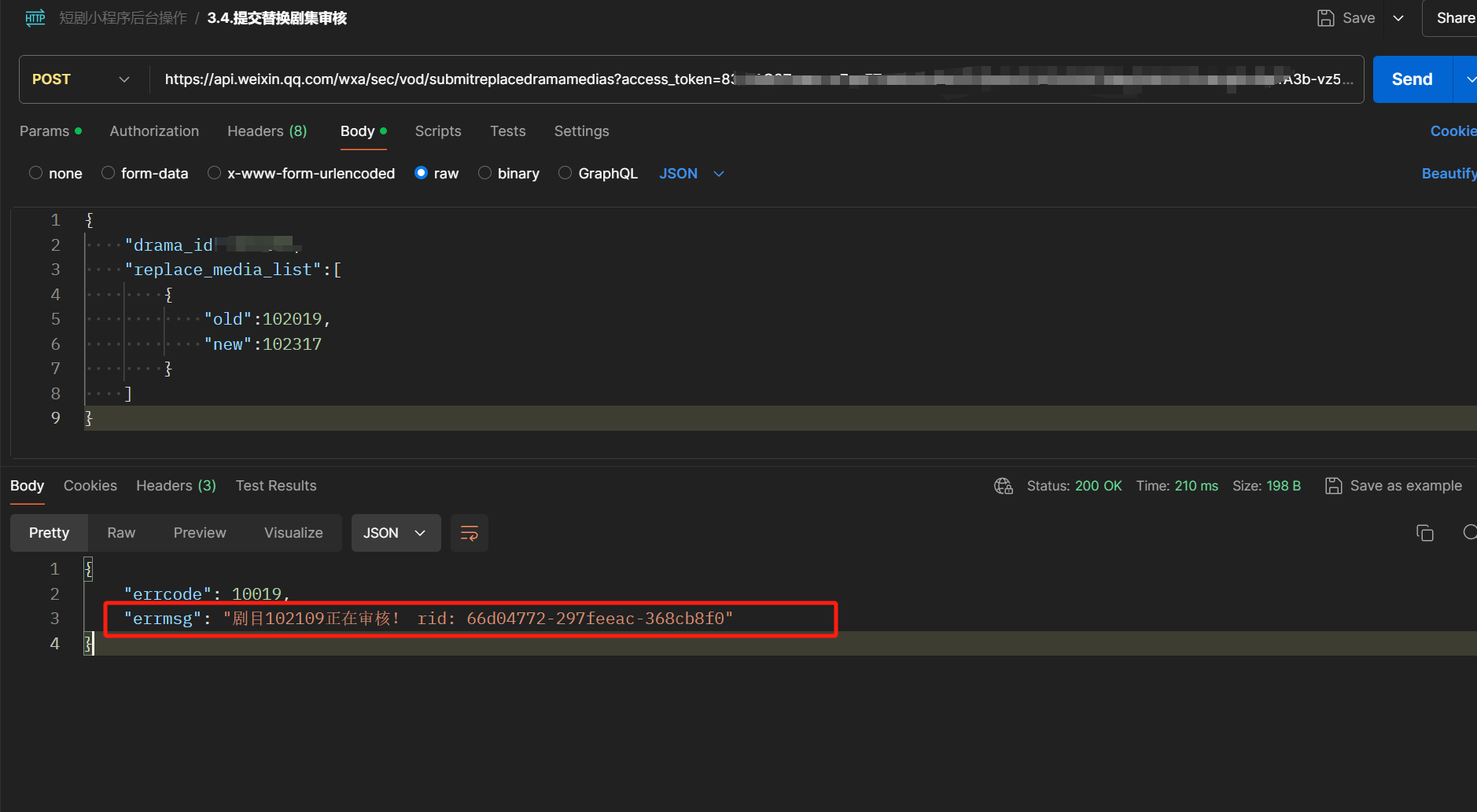 我在后台上传视频并得到了这个新视频的文件id102317,我要用这个新的视频替换掉原来的视频,旧的视频已经审核通过了并且在小程序上能正常播放,但调用提交替换剧集审核接口仍然响应未通过审核,为什么