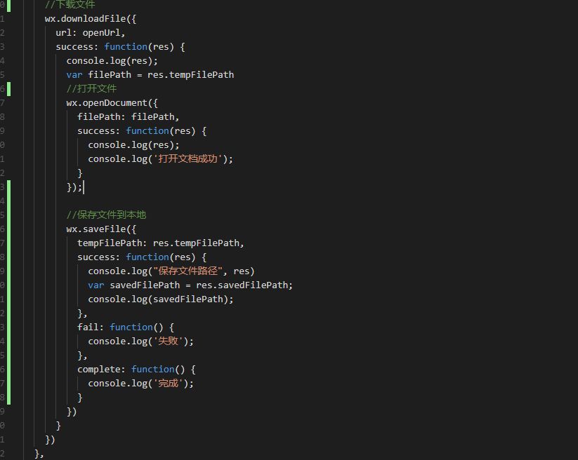 openFile (item) { let that = this wx.showLoading({ title: '下载中...', mask: true }) wx.downloadFile({ url: item.url, filePath: wx.env.USER_DATA_PATH + '/' + item.fullName, success (res) { if (res.statusCode === 200) { wx.hideLoading() console.log(res); // 打开文档 let filePath = res.filePath wx.openDocument({ filePath: filePath, showMenu: true, // 必须设置为true才能分享 success: function (res) { console.log('打开文档成功') }, fail: function (err) { console.log(err, '打开失败'); } }) } } }) },wx.saveFile 后临时路劲就变了所以没法用了wx.openDocument这个官方文档上说了啊