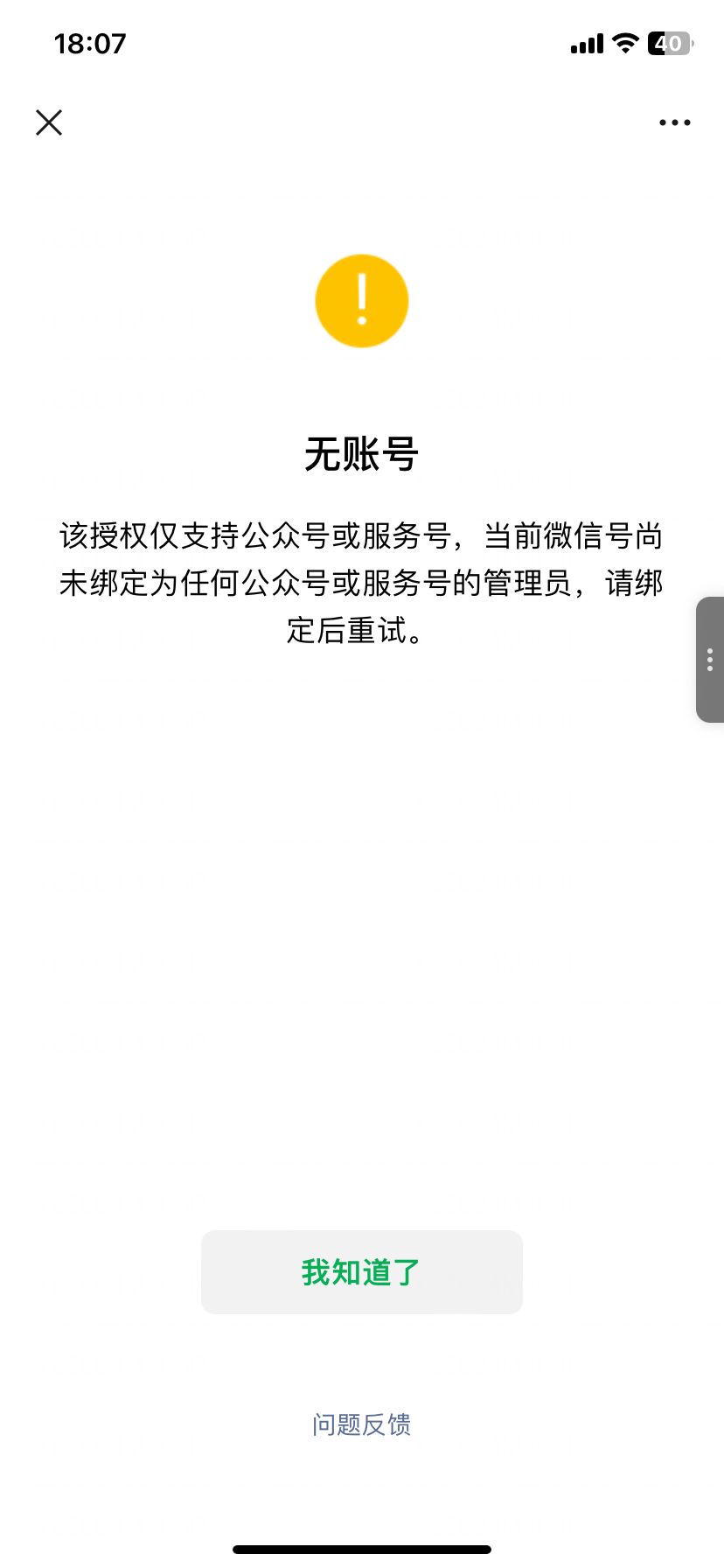 你好,需要公众号或服务号管理员微信扫码授权给第三方平台,参考https://developers.weixin.qq.com/doc/oplatform/Third-party_Platforms/2.0/troubleshooting/authorization_troubleshooting.html#%E4%BA%94%E3%80%81%E5%95%86%E5%AE%B6%E6%8E%88%E6%9D%83%E6%8F%90%E7%A4%BA%E6%97%A0%E6%B3%95%E6%8E%88%E6%9D%83%E3%80%81%E6%97%A0%E8%B4%A6%E5%8F%B7自助排查