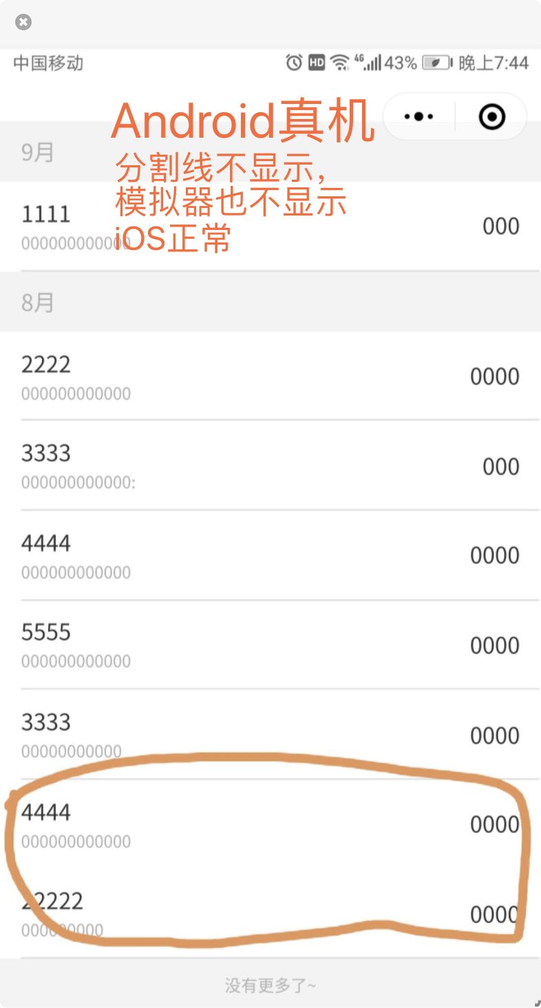.container {display: flex;height:100%;}导致你的列表高度被压缩在一个页面里,1px 的分割线被按比例压缩成不到 1px,所以在某些机型上不显示