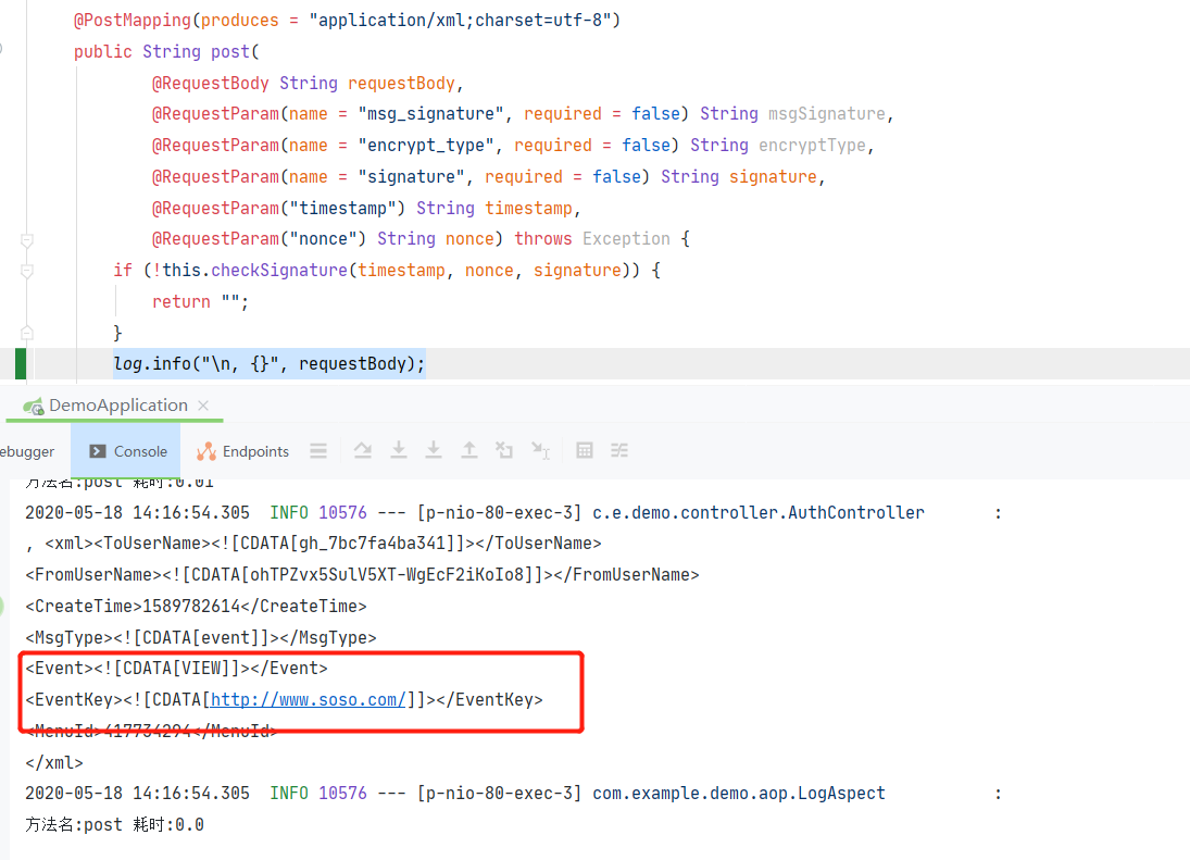 微信公众号点击菜单跳转链接事件推送,在填写的服务器url中没有获取到,,本来是想要在点击跳转后发送一条客服消息给用户,,但是一直获取不到推送事件(不执行我写的代码块)。
