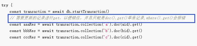 try { const transaction = await db.startTransaction() // 需要更新的记录进行get,以便锁住,并且只能是doc().get()单条记录,where().get()会报错 const aaaRes = await transaction.collection('a').doc(aid).get() const bbbRes = await transaction.collection('b').doc(bid).get() const cccRes = await transaction.collection('c').doc(cid).get() const updateAAARes = await transaction.collection('a').doc(aid).update({...}) // 更新a不成功,抛出错误异常,事务自动回滚 if (!updateAAARes.stats.updated){ throw { msg:'a update error' } } const updateBBBRes = await transaction.collection('b').doc(bid).update({...}) // 更新b不成功,抛出错误异常,事务自动回滚 if (!updateBBBRes.stats.updated){ throw { msg: 'b update error' } } const updateCCCRes = await transaction.collection('c').doc(cid).update({...}) // 更新c不成功,抛出错误异常,事务自动回滚 if (!updateCCCRes.stats.updated){ throw { msg: 'c update error' } } await transaction.commit() console.log(`transaction succeeded`) return { success: true } } catch (e) { console.error(`transaction error`, e) return { success: false, error: e } }