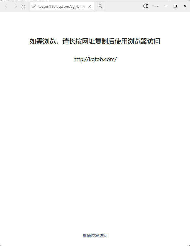 你好,经审核,域名【kqfob.com】下的内容存在违反《微信外部链接内容管理规范》,暂无法恢复微信内直接访问的服务。