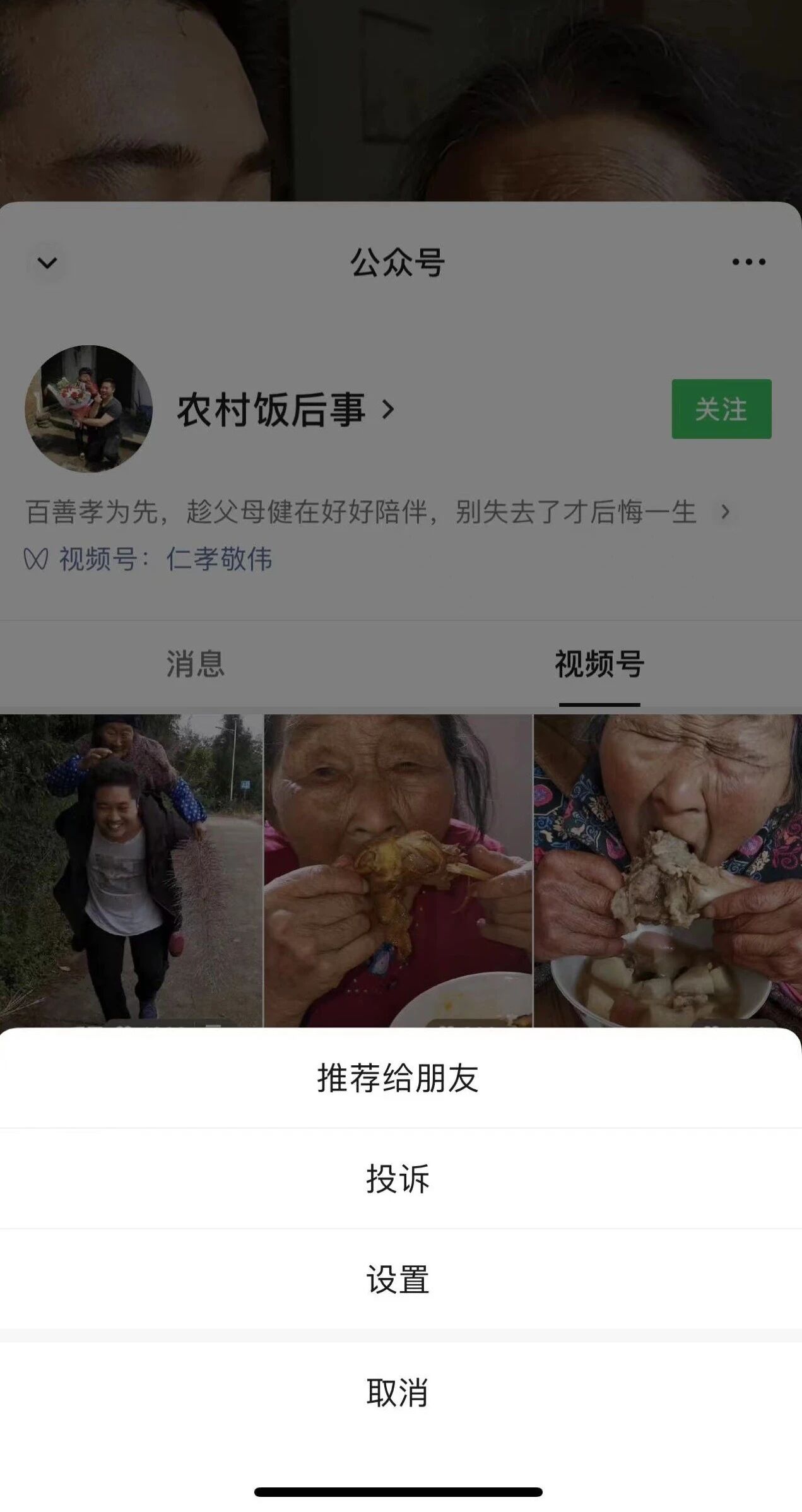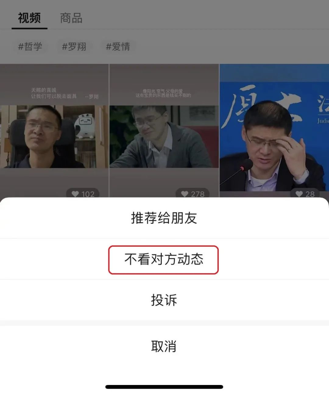 但是最近我发现,很多视频按菜单不再有“不看对方动态”选项(见上图),研究后发现它们都捆绑了公众号