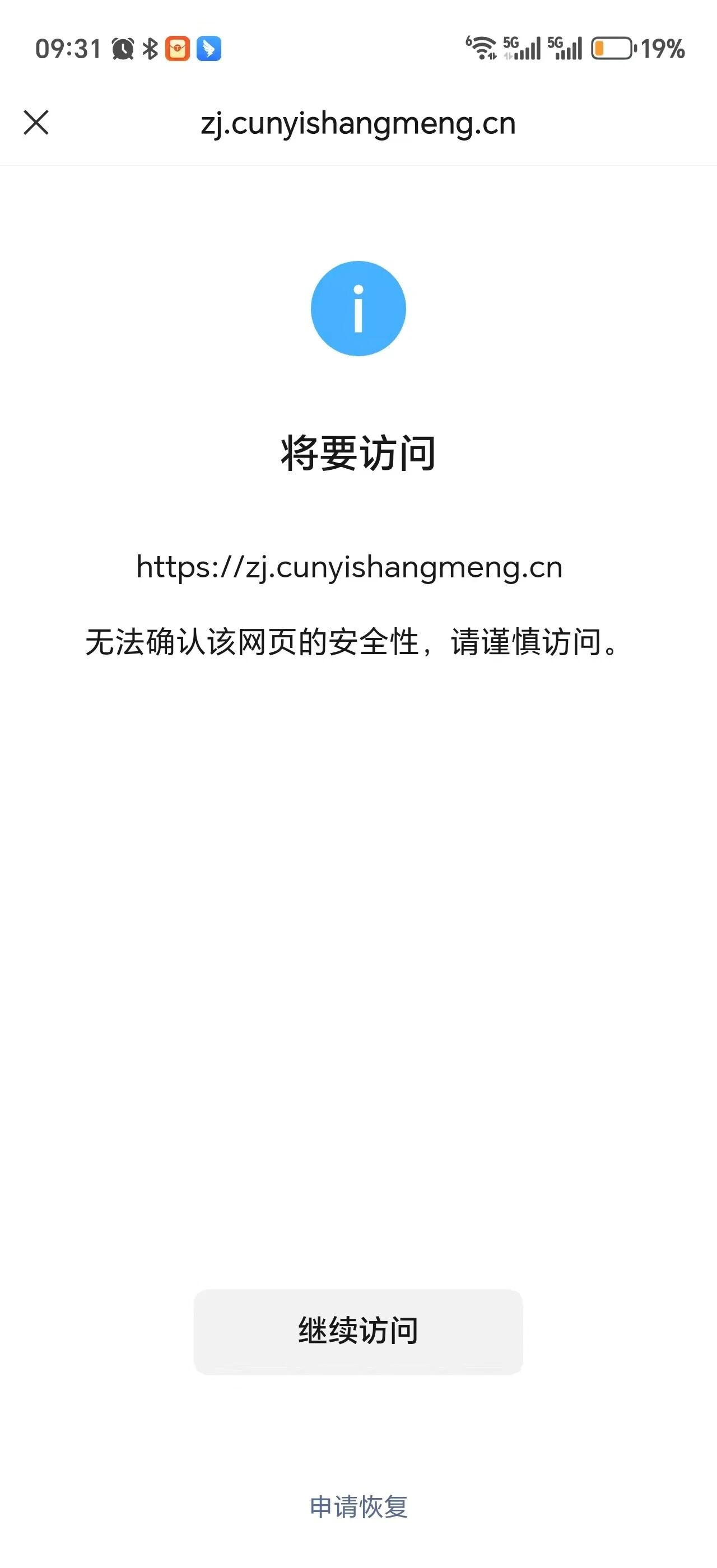 社区技术专员,您好,网站(https://zj.cunyishangmeng.cn),在微信和公众号里访问会提示非微信官方网页,请确认是否继续访问,请问该怎么处理呢?请帮忙核查一下。