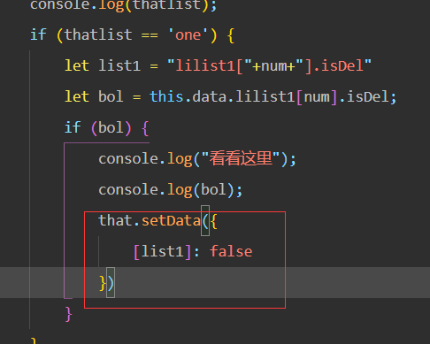 var num = 1 var list1 = `lilist1[${num}].isDel` this.setData({ [list1]: false })