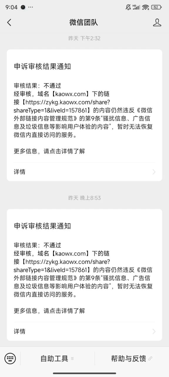 域名 kaowx.com下的链接https://zykg.kaowx.com/share?shareType=1&liveId=157861 违反《微信外部链接内容管理规范》第九条,我想知道具体哪里违规,需要怎么整改?能不能不要AI无脑回答,解决不了问题!!!腾讯自己的网站安全中心检测也是没问题的!!