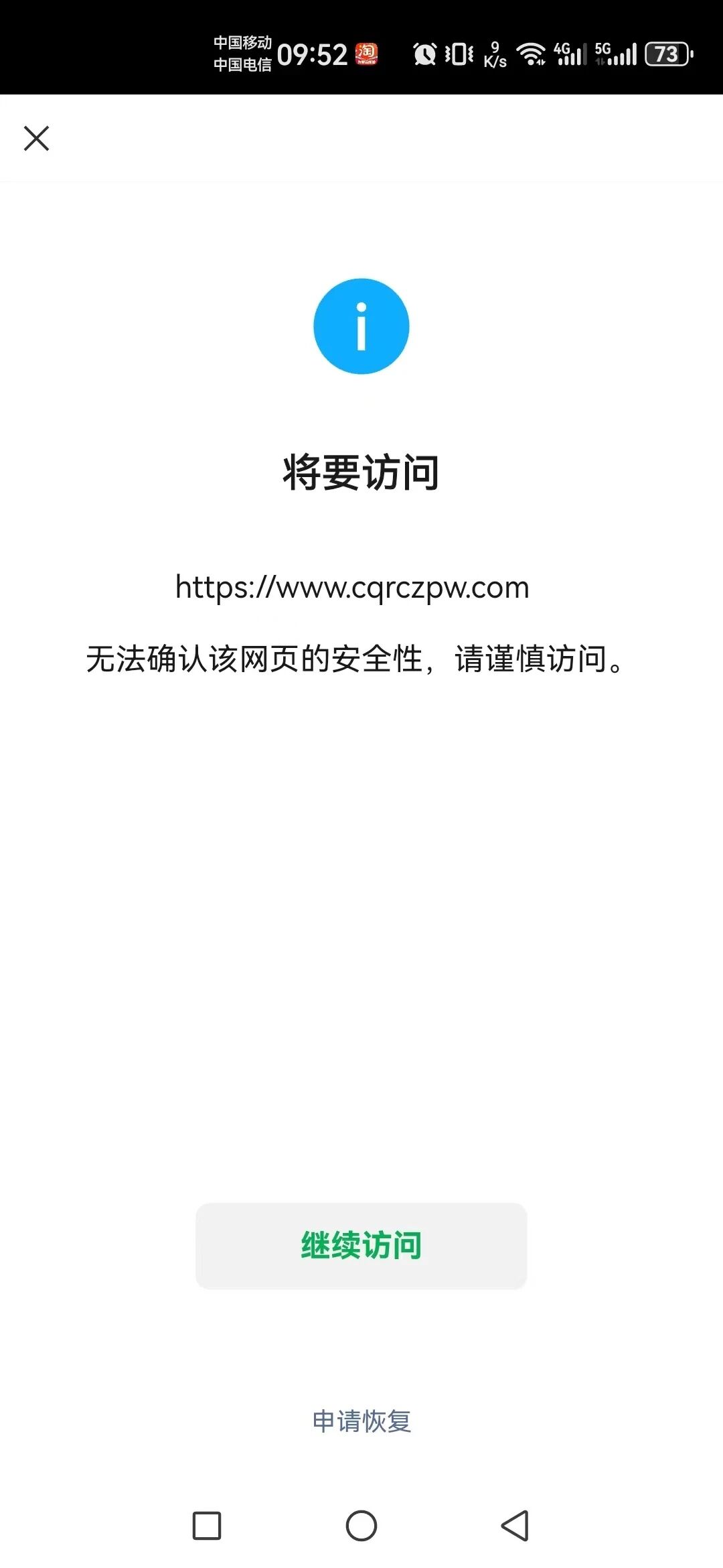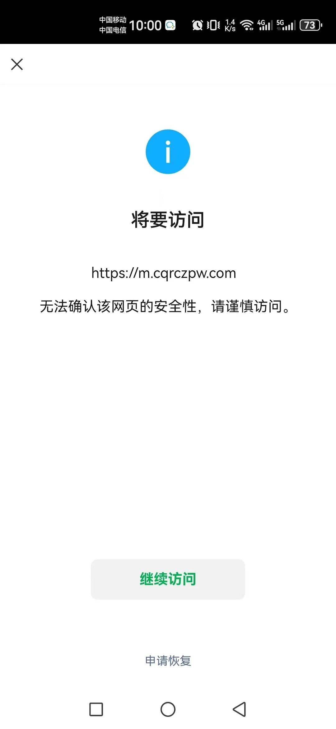你好,域名(www.cqrczpw.com,m.cqrczpw.com)是新注册域名不到一年,最近才因发展需要,才备案建立新站,在微信手机端访问以上域名时,都出现提示“无法确认该网页的安全性,请谨慎访问”,ssL证书一切正常,经核查并无不安全信息内容,请官方核查恢复访问,谢谢。