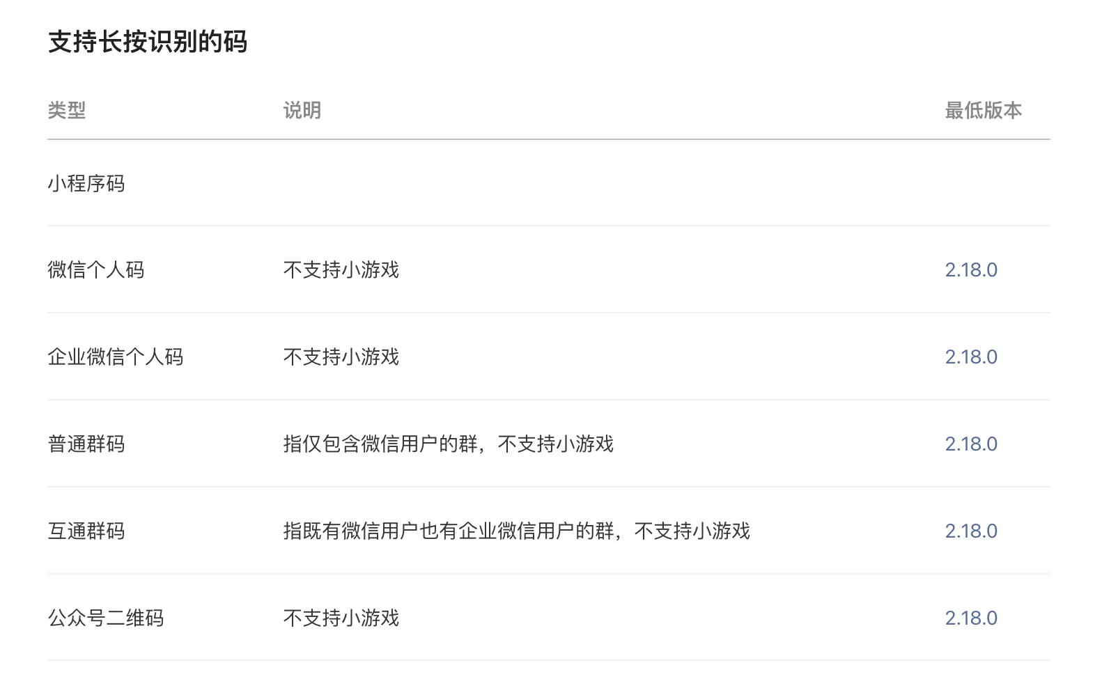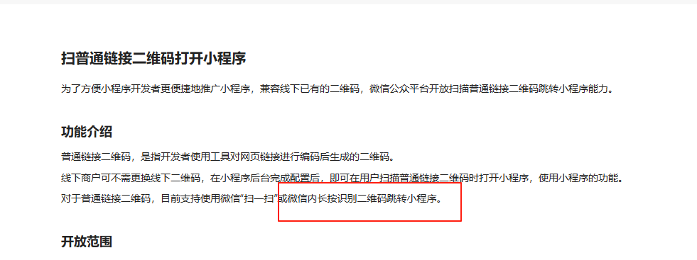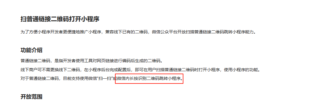 在小程序管理后台,通过“扫普通链接二维码打开小程序”生成的二维码图片,只能扫码进入小程序,无法长按识别