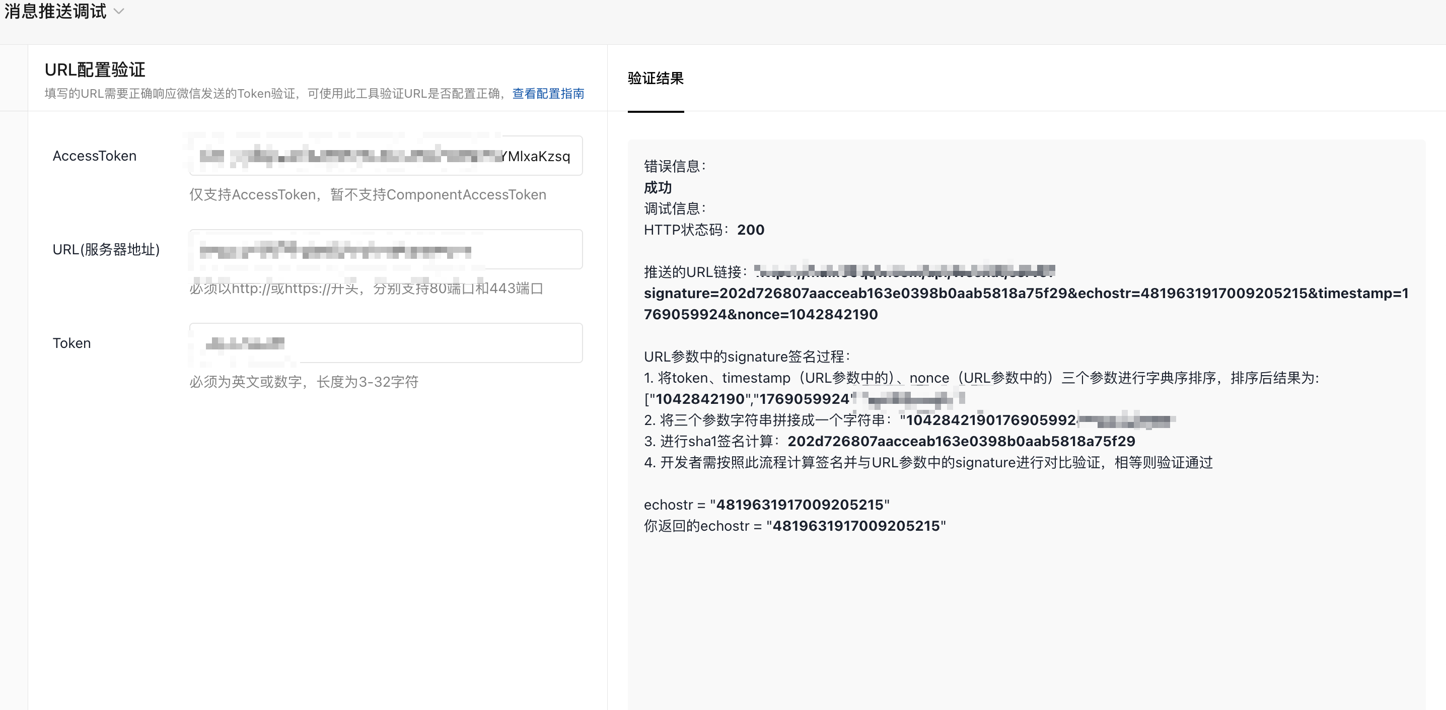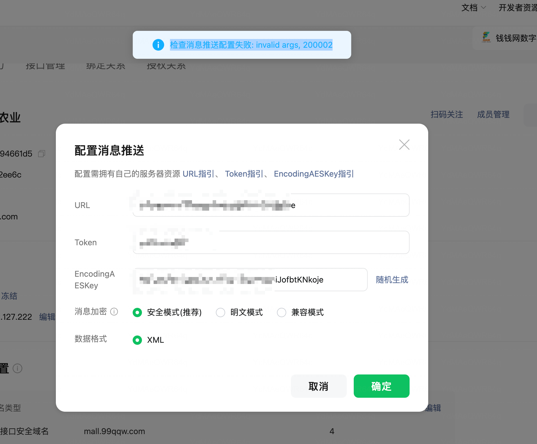 按照官方要求填写配置,提交提示检查消息推送配置失败: invalid args, 200002。请问如何解决