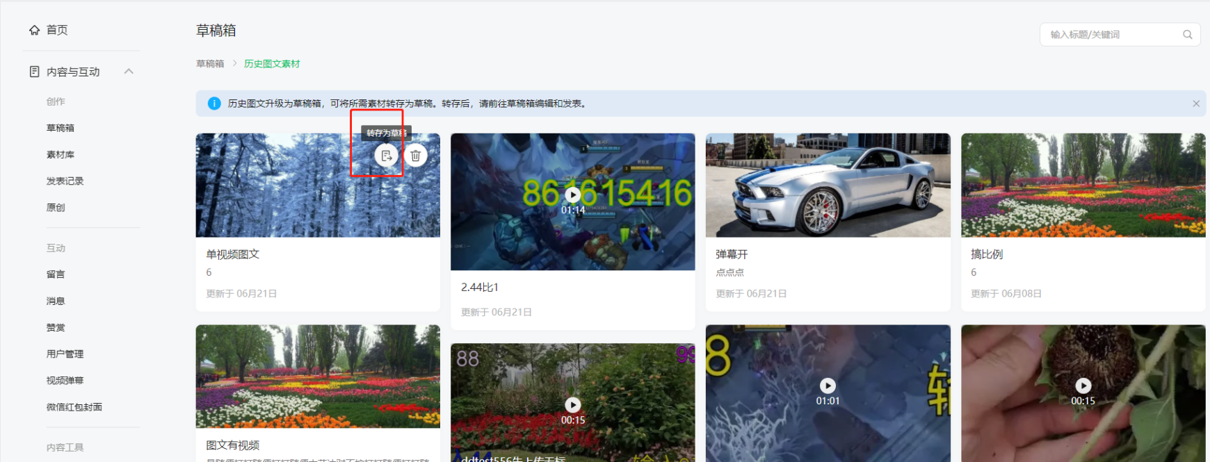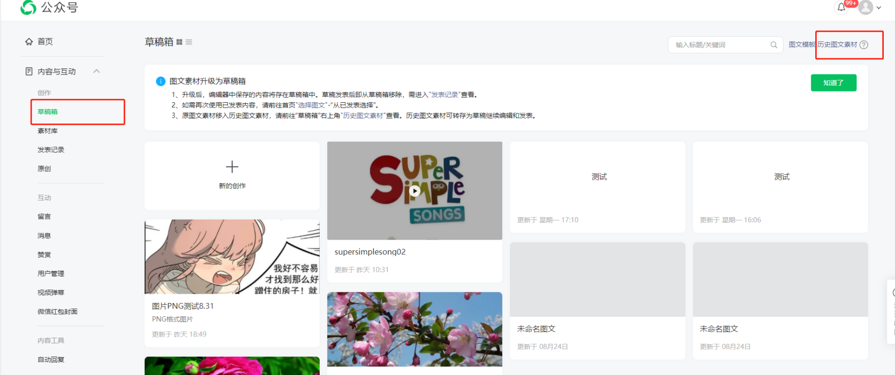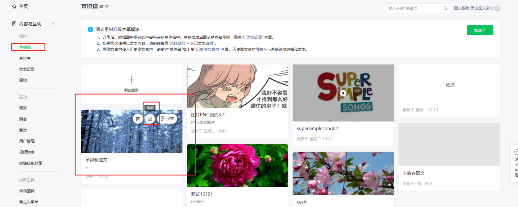 我只需要更新以前文章的内容,现在变成草稿箱之后我根本就无法使用微信平台了,不好修改也不好弄,太奇怪了,能不能恢复到以前的图片素材库,我现在属于无法更新内容了
