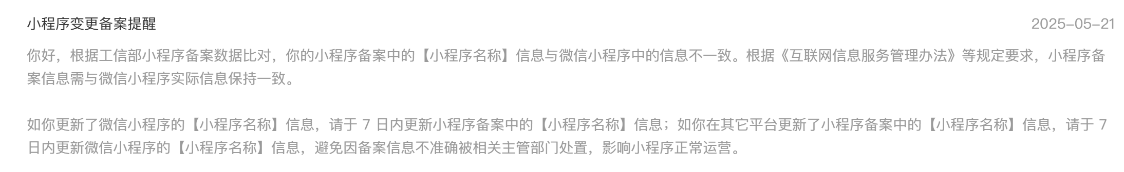 备案信息中小程名称需与小程序名称一致,请在【小程序管理后台-设置-小程序备案-变更】发起变更备案,更新备案信息,确保备案信息真实有效。