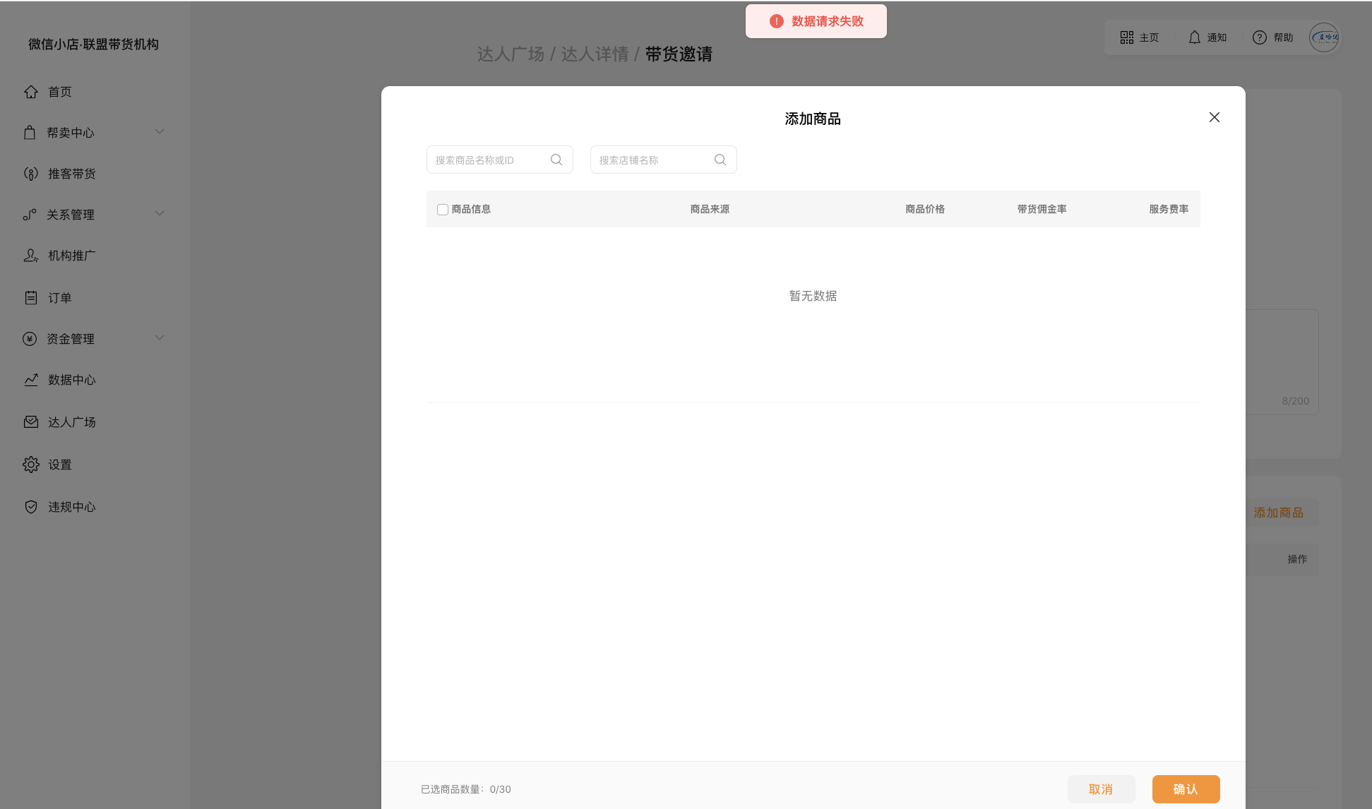 微信小店联盟带货机构 在达人广场,挑选完达人之后,发送带货邀请添加商品时提示:数据请求失败。 烦请帮助查看什么原因。
