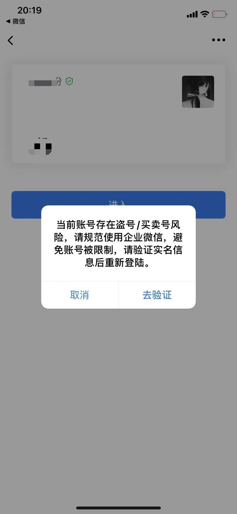 手机企业微信扫码登录电脑版企业微信后,过了大概20分钟微信弹出一个提示确认是否本人操作,当时在忙不知道是否点错了,一会儿后手机企业微信和电脑企业微信全部掉线,再次登录手机企业微信提示“账号存在盗号/买卖风险,请验证实名信息后重新登录”,下一步输入姓名和身份证去验证时,又弹出”当前验证信息与账号已登记信息不一致“。使用不同登录方式、在新设备登录等等均出现上述一样问题(姓名与身份证号确认正确)。现在进不去企业微信,关注了企业微信公众号,联系客服又是智能客服解决不了,又找不到人工客服或者电话,没途径解决,希望能快速解决此问题。