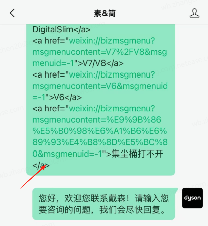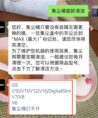 异常:9-09 07:21:28 appId = wx044b19d23ef9c875, sendStr = {"touser":"oDU32s5kOgcuFqZQH6NuoHu4UGOs","msgmenu":{"tail_content":"","list":[{"content":"G5","id":-1},{"content":"V10/V11/V12/V15/DigitalSlim","id":-1},{"content":"V7/V8","id":-1},{"content":"V6","id":-1},{"content":"集尘桶打不开","id":-1}]},"msgtype":"msgmenu"}, async = true, needTips = false
