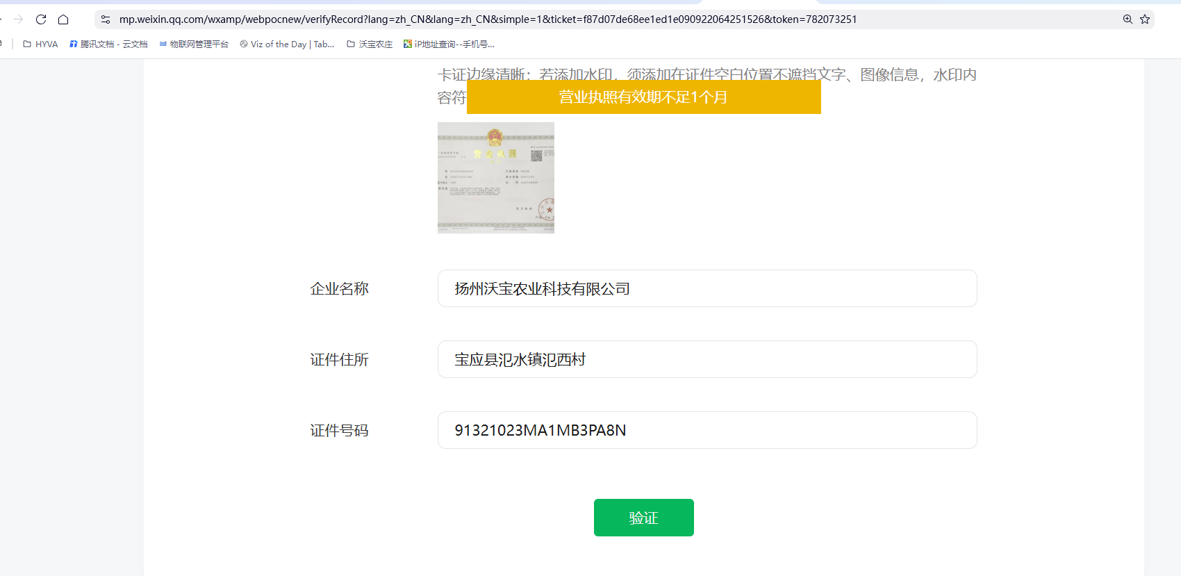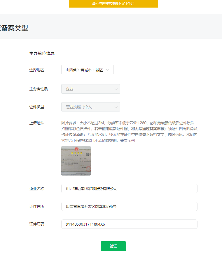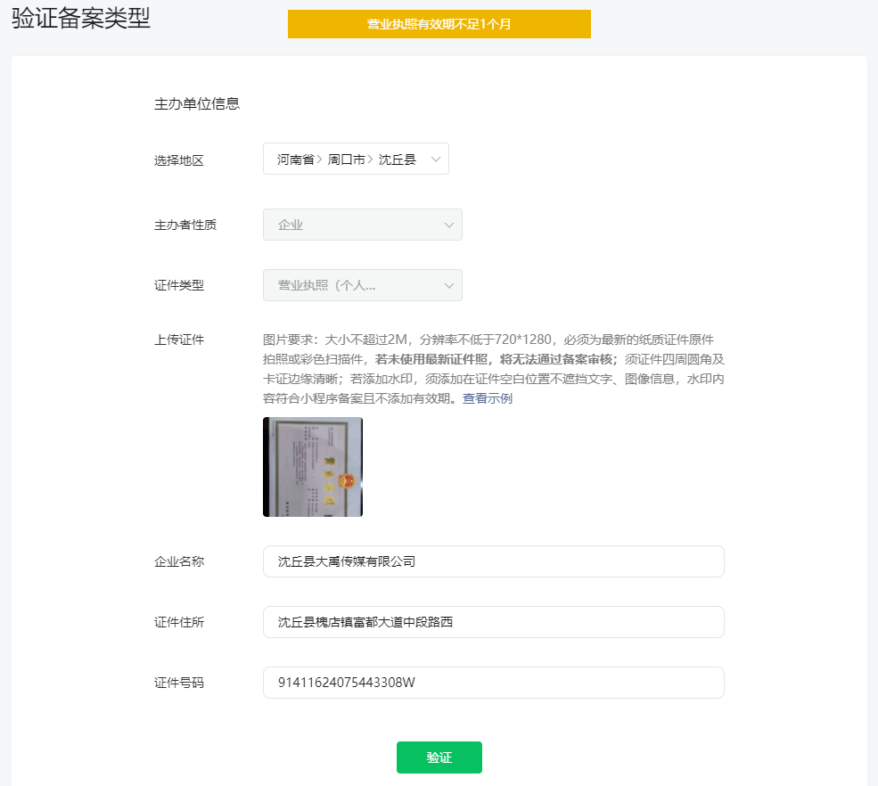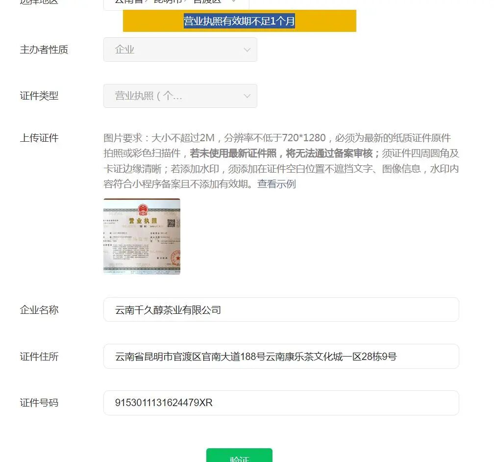 这个小程序提交备案提示营业执照有效期不足一个月,营业执照已经换了新的。请帮协助操作下
