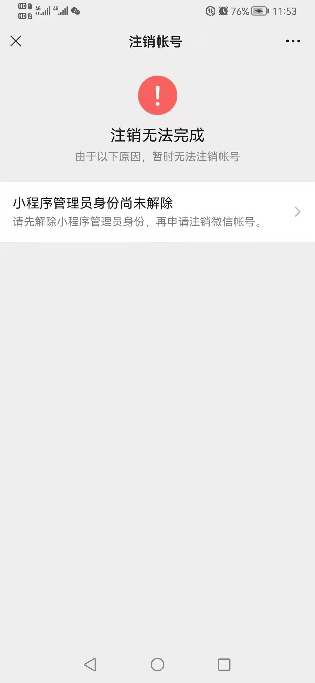 注销了微信小程序,但是注销微信依旧提示 小程序管理员身份尚未解除,到底还要多久才能注销啊,,好烦人啊