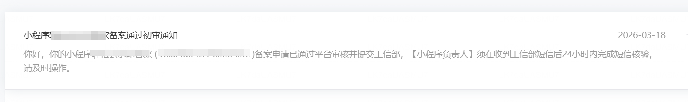 3-18微信公众号平台通知备案通过初审,备案状态为"管局审核中”,但一直没收到工信部的核验短信。