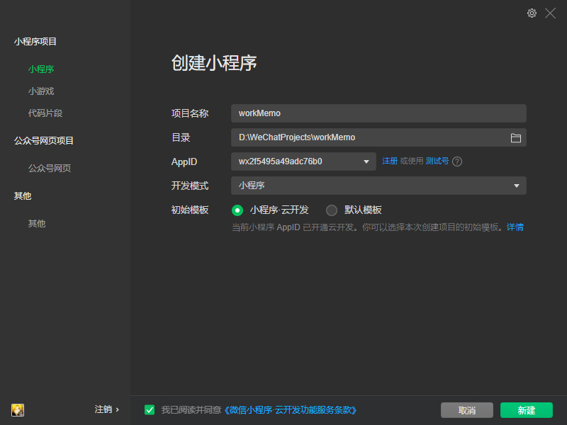 选择“默认模板”能成功,但是选择“小程序·云开发”初始模板,就始终无法新建项目。