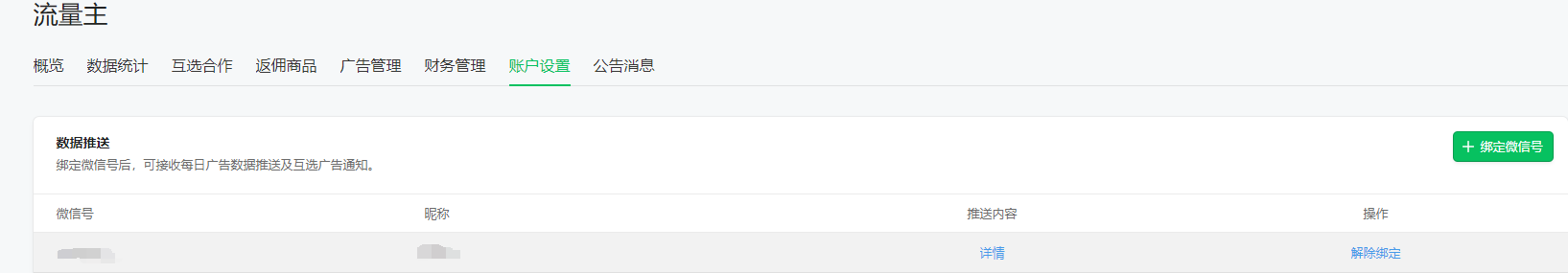 流量主通过“账户设置-数据推送”页面,绑定微信号,即可通过公众号“微信广告助手”每日收到数据推送。