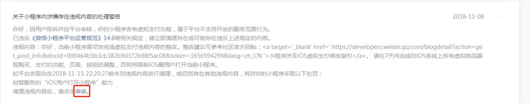 然后今天封了我的小程序iOS端访问。我上去公众后台看,发现要点击回原来的申诉入口,才可以看到原来的申诉结果。