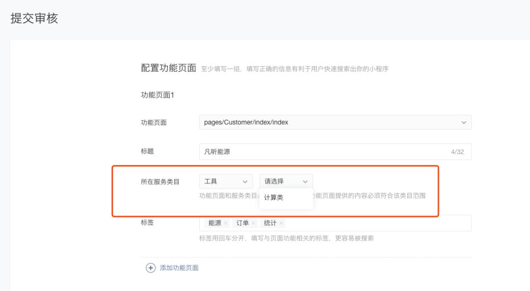 你的小程序"凡昕能源"代码发布审核未通过,原因如下:1:服务类目"工具-计算类_"与你提交代码审核时设置的功能页面内容不一致:(1):你好,贵方小程序涉及提供办公工具、服务,请选择工具-办公类目