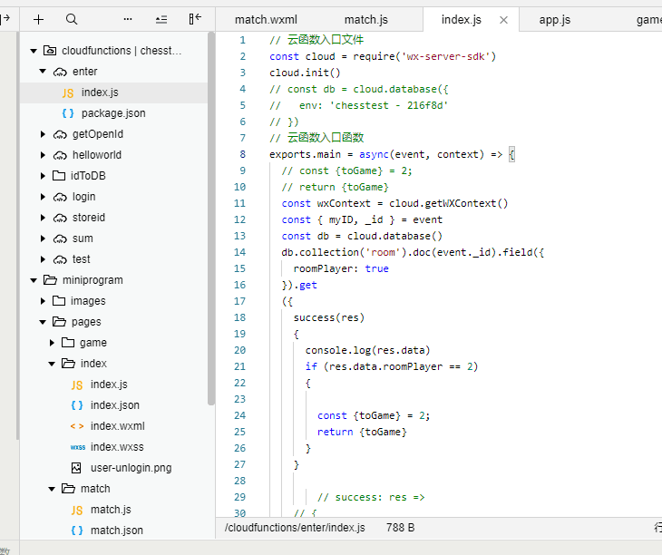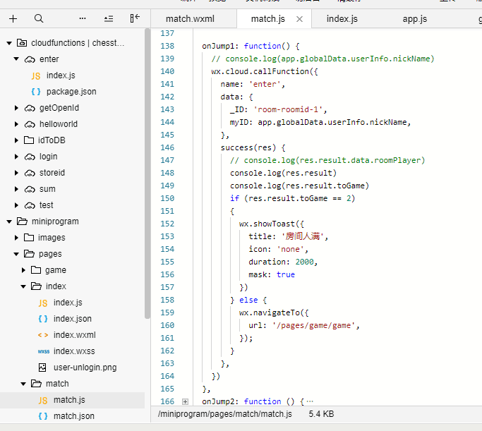 我的逻辑是这个样子的,小程序端,把我的nikename和roomID作为云函数参数,根据返回值,判断提示房间满还是进入游戏;云函数端,根据roomID读取该数据库内玩家人数,如果两个人返回2,一个人或者没有人返回1,