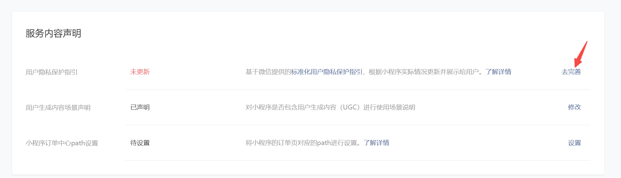 你好,建议前往“https://mp.weixin.qq.com/登录你的小程序-设置-服务内容声明模块”或代码提审时完善《用户隐私保护指引》。可参考:https://developers.weixin.qq.com/community/develop/doc/00062a6d514c88baacdf52e8a56009