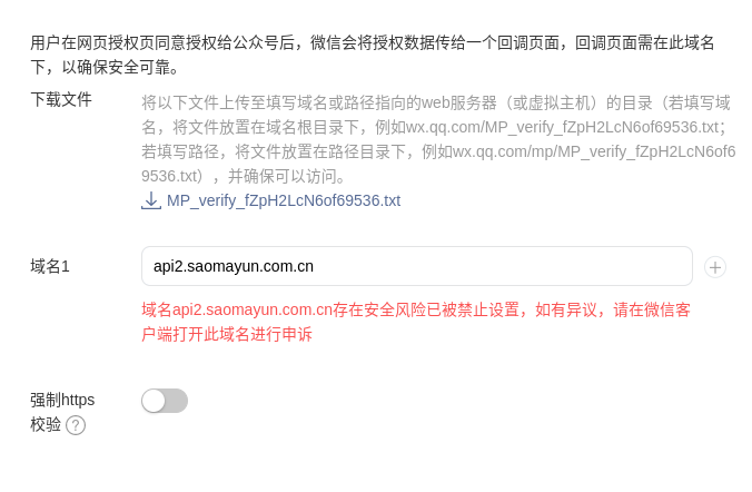 但是这个域名在另一个公众号下,这个域名又是可以正常保存的,然后 我换了很多其他的域名也出现了这样的提示.