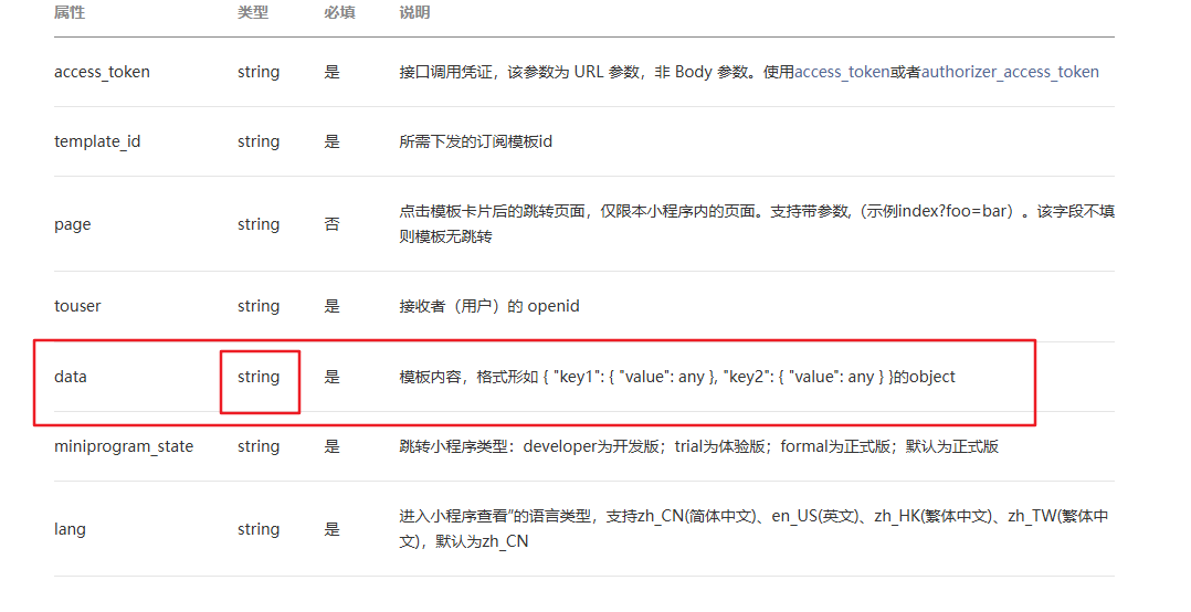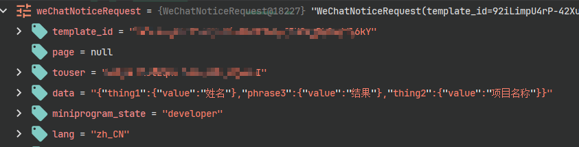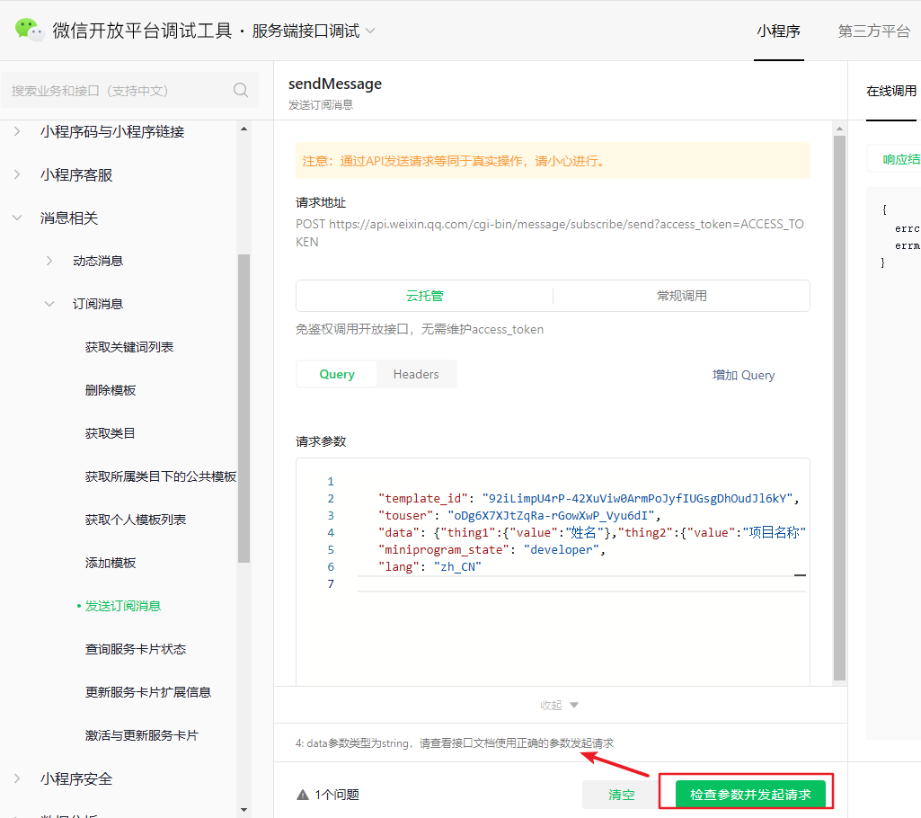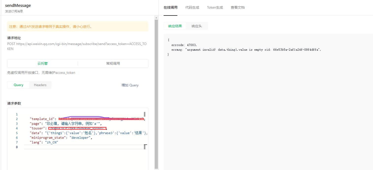 我选用了一个模板信息,关键词设置如图所示 前端真机订阅完成。我使用API发送订阅消息设置填充内容。报错47003 debug 以及测试如下图所示不知道时什么原因 thing1 这不是明明有值的吗?