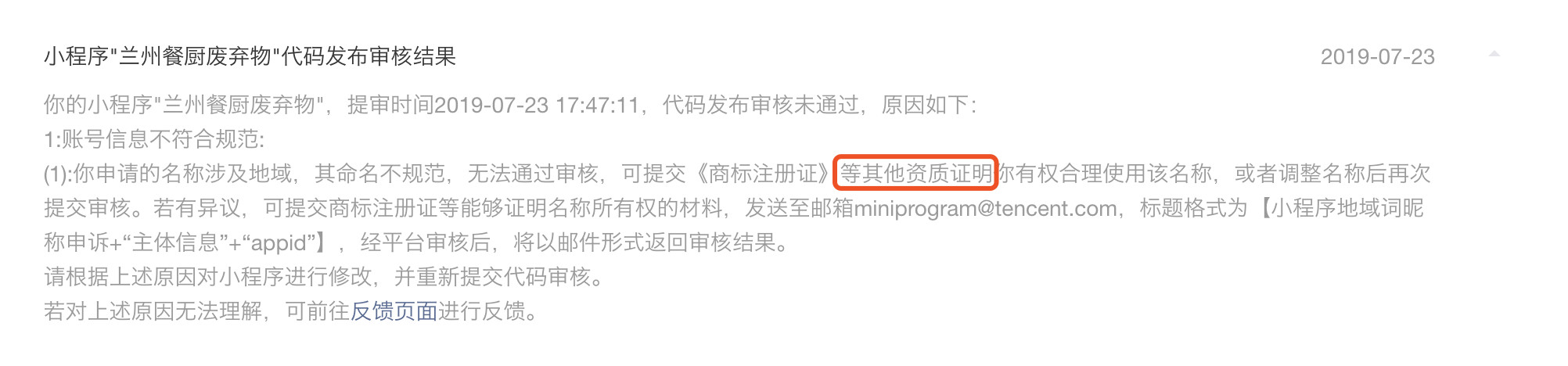 你好,可提交商标注册证证明你有权合理使用该名称,发送至邮箱miniprogram@tencent.com,标题格式为【小程序地域词昵称申诉+“主体信息”+“appid”】,经平台审核后,将以邮件形式返回审核结果,请留意邮件审核结果