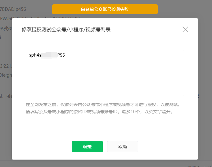 测试账号中添加视频号ID报错(sph开头的)。添加公众号、小程序原始ID是能成功的(gh_开头的)