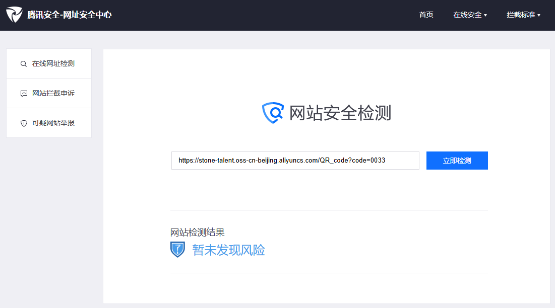 我公司只不过是用了阿里云的公用域名,但是网站内容不涉及任何违规违法的东西,并且,阿里云公用域名【oss-cn-beijing.aliyuncs.com】、以及我公司的业务网站:https://stone-talent.oss-cn-beijing.aliyuncs.com/QR_code?code=0033 在网址安全中心进行检测,也并没发现风险。