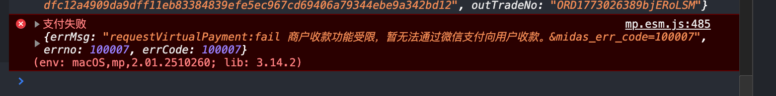 "requestVirtualpayment:fail 商户收款功能受限,暂无法通过微信支付向用户收款。&midas_err_code=100007",er100007,errCode:100007}