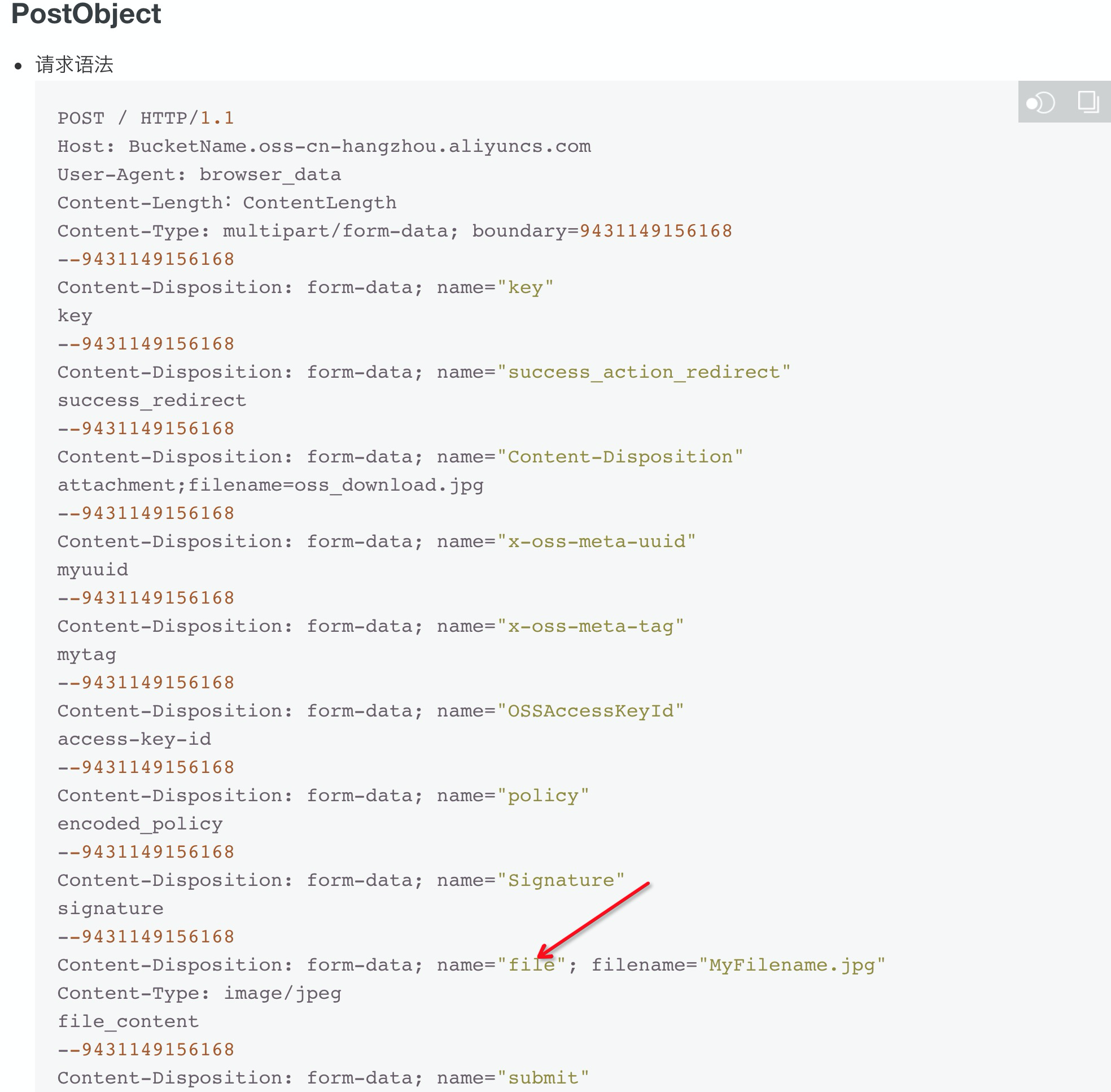 但是,在实际上传文件(图片)使用中,改参数只能为: 'file',按照文档中的解释,传递为文件的key值(OSS中对文件的标识)时,会得到‘IncorrectNumberOfFilesInPOSTRequest’这个错误。