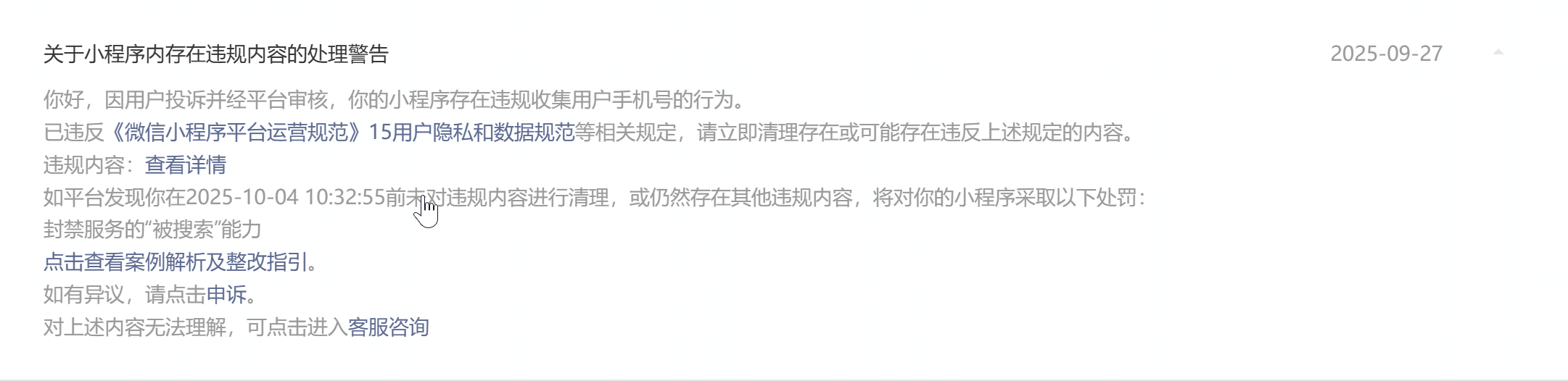 你好,请登录微信公众平台查看站内信,根据指引内容进行排查,确保最新版本审核通过且发布完成后,再发起申诉。