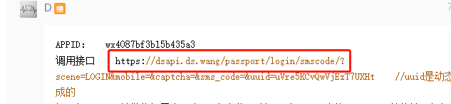 调用接口 https://dsapi.ds.wang/passport/login/smscode/?scene=LOGIN&mobile=&captcha=&sms_code=&uuid=uVre5KCvQwVjEzT7UXHt //uuid是动态生成的