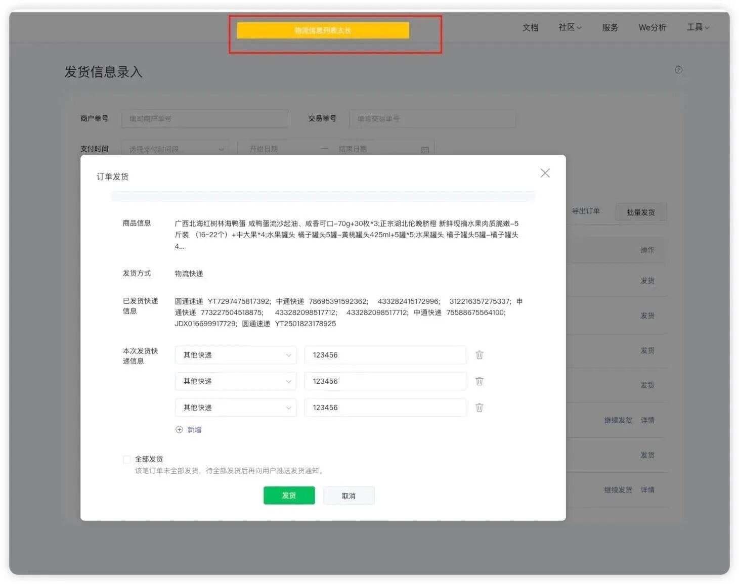 1、勾选全部发货,提示报错:统一发货模式下,物流信息列表长度必须为1