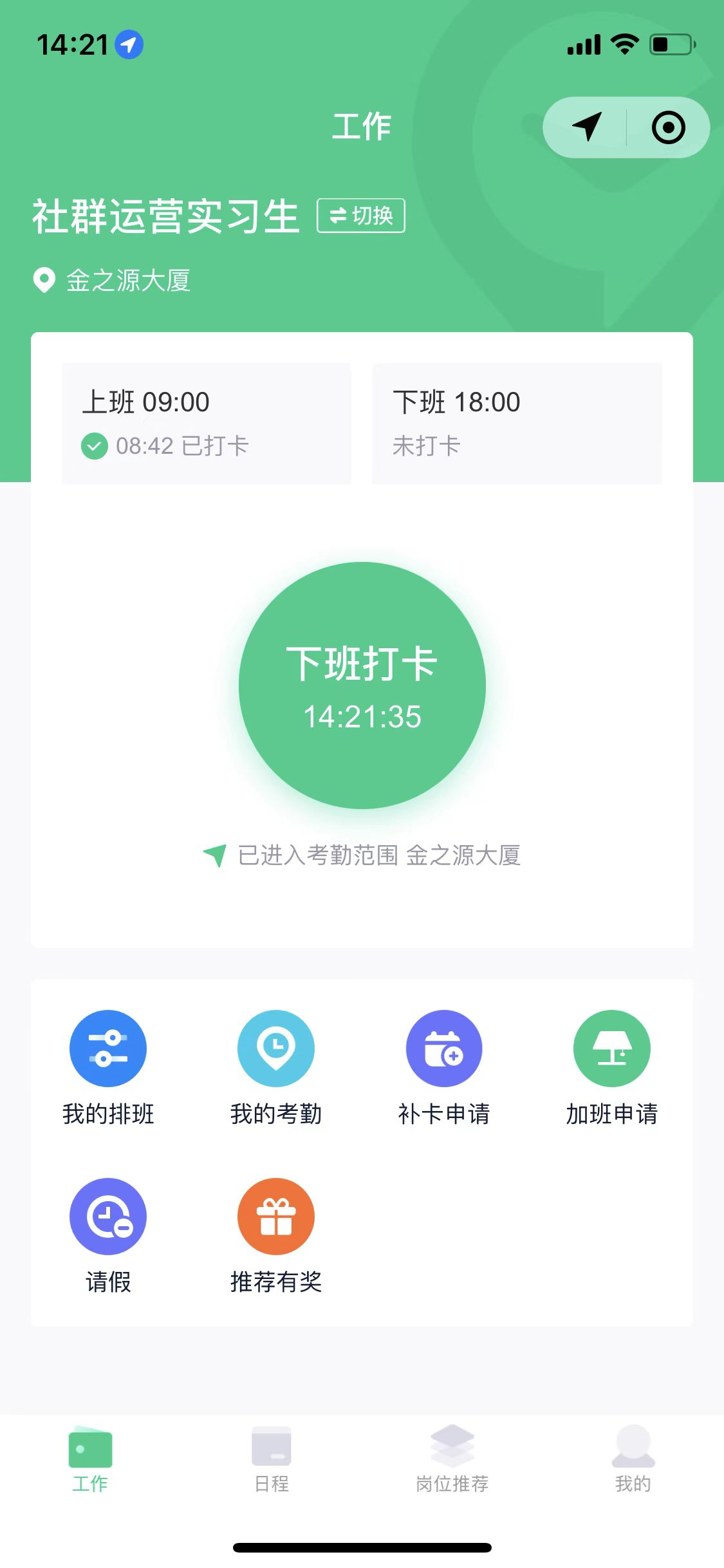 描述:用户端,用户报名被录取后,在用户端展示签到打卡到勤界面,获取用户当前地理位置用于考勤打卡。