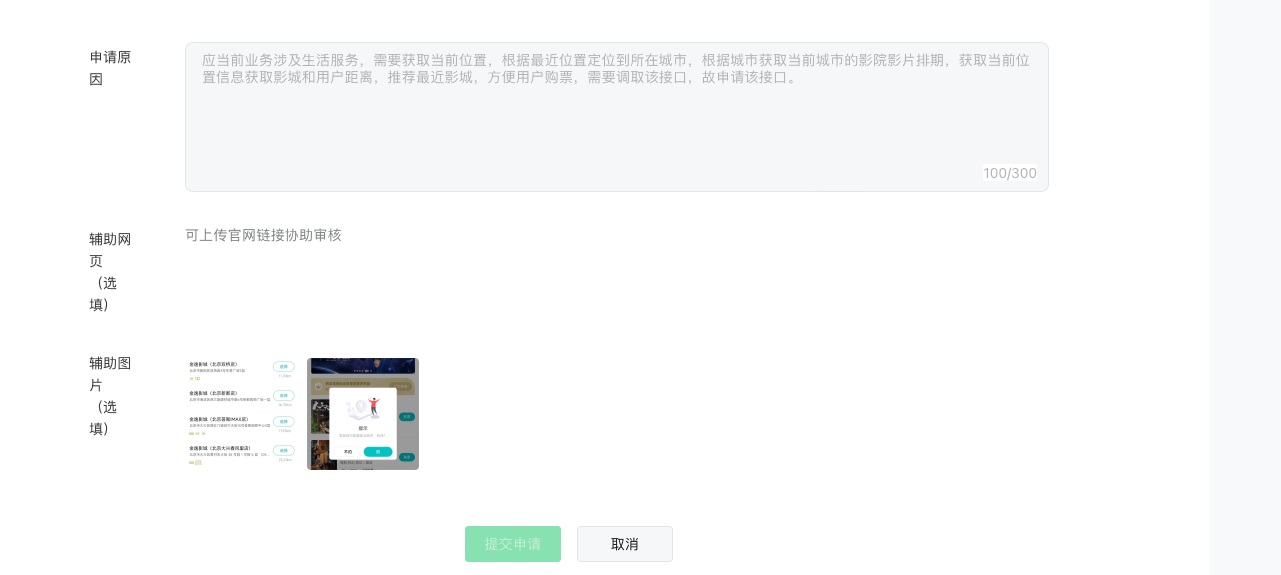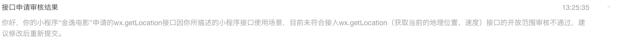 你好,核实到小程序申请wx.getLocation接口审核不通过,根据提交的申请信息可知申请该接口是用于【根据当前定位展示附近的影院以及计算距离】,不符合wx.getLocation接口使用场景开放范畴。建议使用wx.getFuzzyLocation、wx.chooseLocation或wx.choosePoi接口实现上述场景。可参考相关案例解析:https://developers.weixin.qq.com/community/develop/doc/000646718d40a08a65ed1e2175bc09
